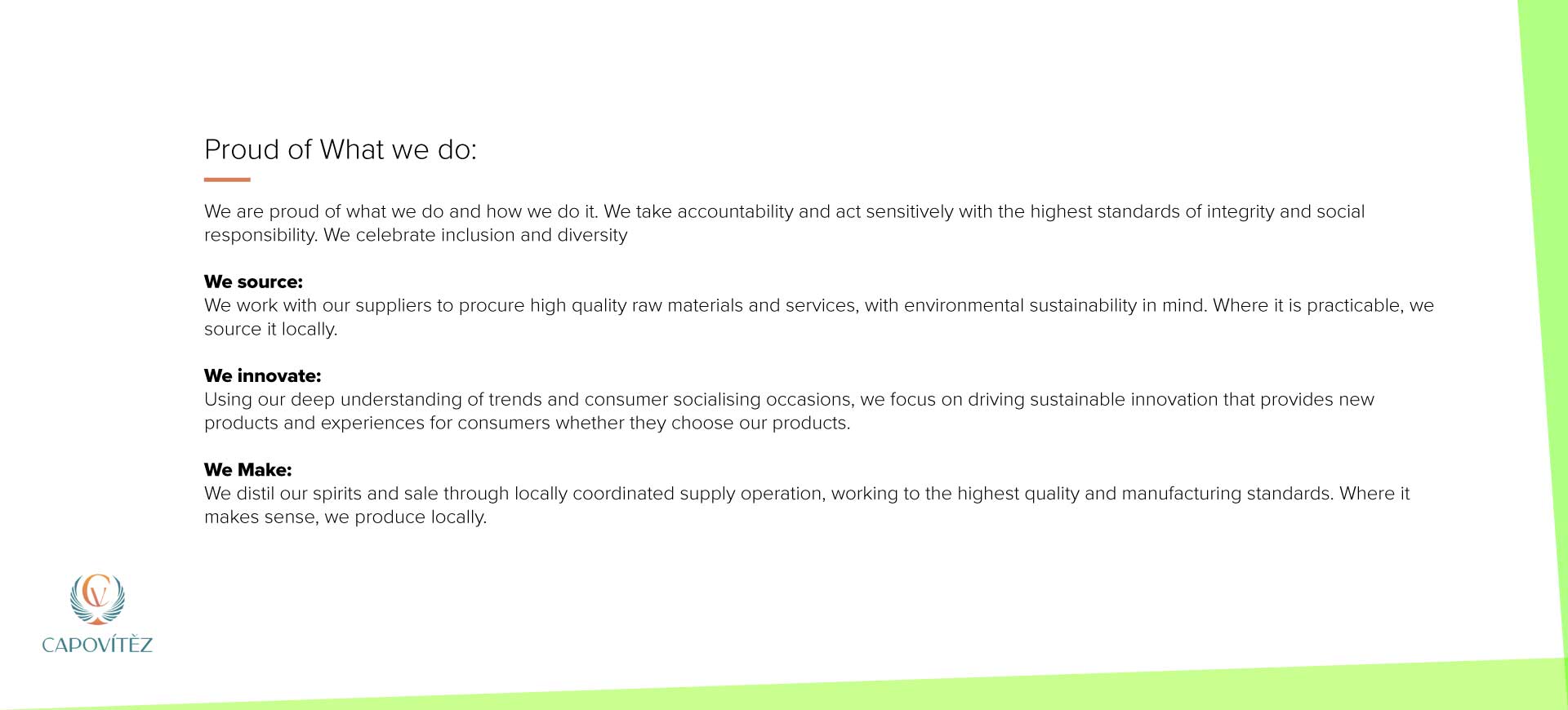 Capovitez is built on the pillars of integrity in business, a commitment to quality in every product, and a relentless pursuit of innovation in the spirits industry.